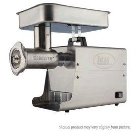 All stainless steel motor housing, all metal gears with roller bearings, heavy duty handle for easy moving, 110 volt, permanently lubricated motor with improved grease formulation to reduce motor noise, built-in circuit breaker, stainless steel knife, head, auger and large meat pan, stainless steel coarse (3/8″) and fine (3/16″) plates, 3 stuffing tubes (5/8″, 1″, 1-3/8″ OD), and meat stomper.