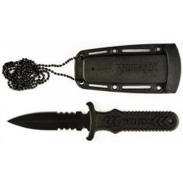 Neck/Boot Knife, black titanium nitride coated 1/3 serrated spear point blade; glass reinforced nylon handle with non-slip rubber edges; glass reinforced nylon sheath with reversible metal boot clip, black oxide finish copper neck chain, blade: 3″ overall, 6-3/8 “.